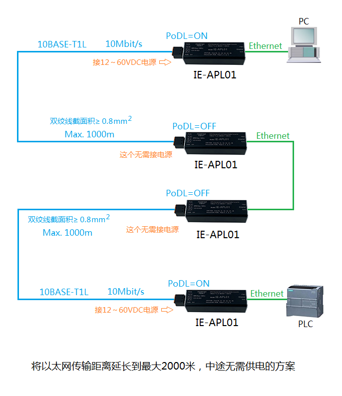 最大傳輸距離 | 1000米。如果使用PoDL供電,則距離受功率和電纜截面積限制。 |