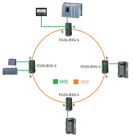 使用FO2G-IE5G-S(型號中帶G的支持環(huán)網(wǎng))光纖適配器升級為光纖環(huán)網(wǎng)如圖2-3所示,由于FO2G-IE5G-S光纖適配器本身具有環(huán)網(wǎng)功能,所以在PROFINET網(wǎng)絡(luò)組態(tài)中不能組態(tài)成環(huán)網(wǎng)。特別適合不具備環(huán)網(wǎng)功能的設(shè)備或只有一個網(wǎng)口的設(shè)備組成光纖環(huán)網(wǎng),也可組成網(wǎng)線環(huán)網(wǎng)或光纖網(wǎng)線混合環(huán)網(wǎng)。