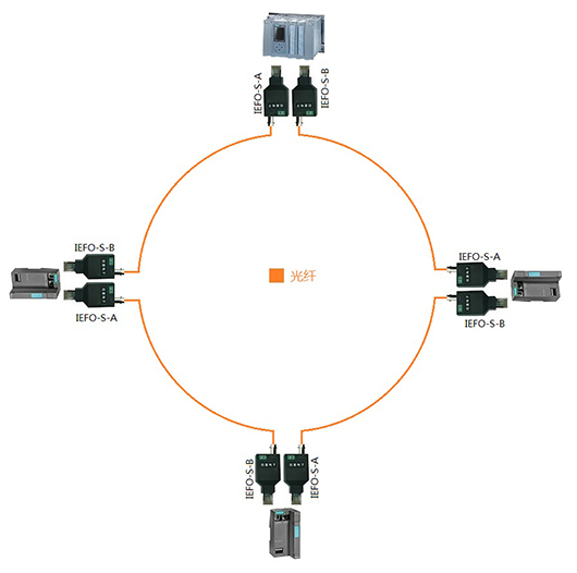 使用IEFO-S-A和IEFO-S-B光纖適配器升級為光纖環(huán)網(wǎng)如圖2-2所示,特點是PROFINET網(wǎng)絡(luò)組態(tài)同電纜環(huán)網(wǎng)相同,即組態(tài)成環(huán)網(wǎng),其功能與網(wǎng)線連接時完全相同。