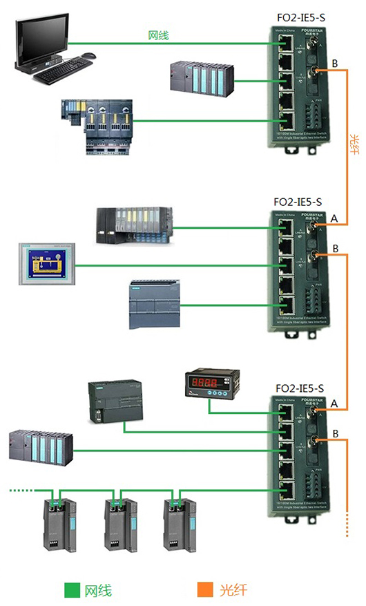 升級成總線型光纖網(wǎng)絡(luò)可以使用四星電子的迷你型工業(yè)以太網(wǎng)光纖適配器IEFO-S-A(A光口)和IEFO-S-B(B光口)或單纖2光5電工業(yè)以太網(wǎng)光纖鏈路適配器FO2-IE5-S。光纖的連接安裝A光口連B光口、B光口連A光口的原則連接。