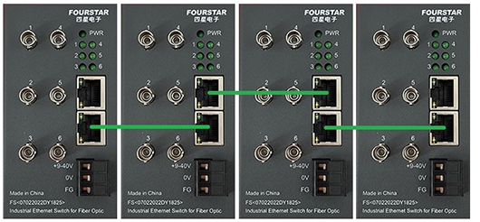 將多個FO6-IE2-S的網(wǎng)口依次級聯(lián)起來,就可組合成更多光口的光纖交換機(jī),如圖3-2所示,4臺FO6-IE2-S的網(wǎng)口級聯(lián)后組合成4×6=24個光口的光纖交換機(jī),以此類推。