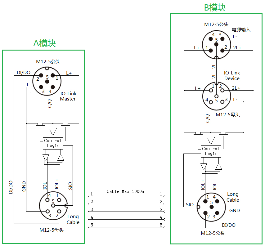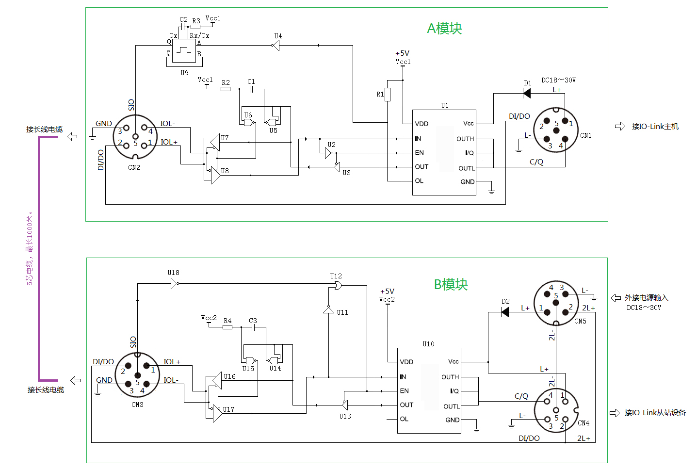 如圖2-1所示,本方案分為A模塊和B模塊,A模塊連接IO-Link主站,B模塊連接IO-Link HUB或IO-Link從站設(shè)備,用一根5芯電纜連接A模塊和B模塊。從圖中可看出,其基本原理是將IO-Link接口的單端雙向傳輸方式轉(zhuǎn)換為差分雙向傳輸,這樣就可大大的延長IO-Link的傳輸距離。并能自適應(yīng)IO-Link的通訊速率COM1(4.8Kbps)、COM2(38.4Kbps)、COM3(230.4Kbps),A模塊和B模塊之間的電纜最大長度可達1000米。