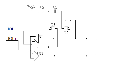 如圖2-3所示,由與非門U5、U6控制電路和U6、U7差分發(fā)送器和差分接收器完成將TTL電平轉(zhuǎn)換成差分信號傳輸,合理選擇R2和C1的參數(shù)使其適應(yīng)IO-Link的不同通訊速率COM1(4.8Kbps)、COM2(38.4Kbps)、COM3(230.4Kbps)。