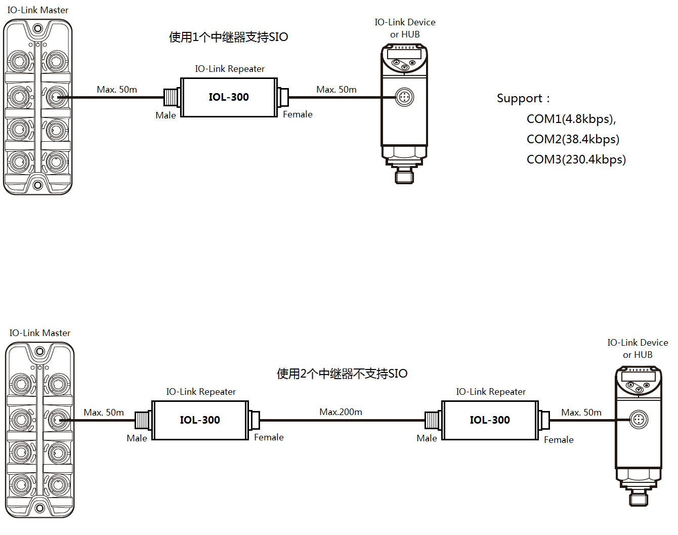 圖4-1是四星電子的無需外接電源的IO-Link中繼器產(chǎn)品實物照片,可單個或二個使用,圖4-2是該產(chǎn)品的應(yīng)用連接拓撲。使用一個可將IO-Link最大通訊距離延長到100米并且支持SIO;使用二個可將IO-Link最大通訊距離延長到300米,不支持SIO。通訊速率COM1(4.8Kbps)、COM2(38.4Kbps)、COM3(230.4Kbps)自適應(yīng)。