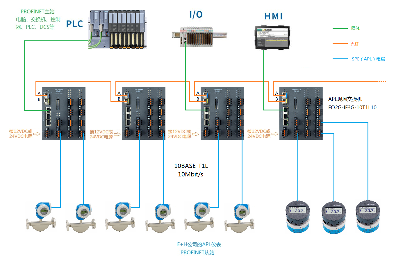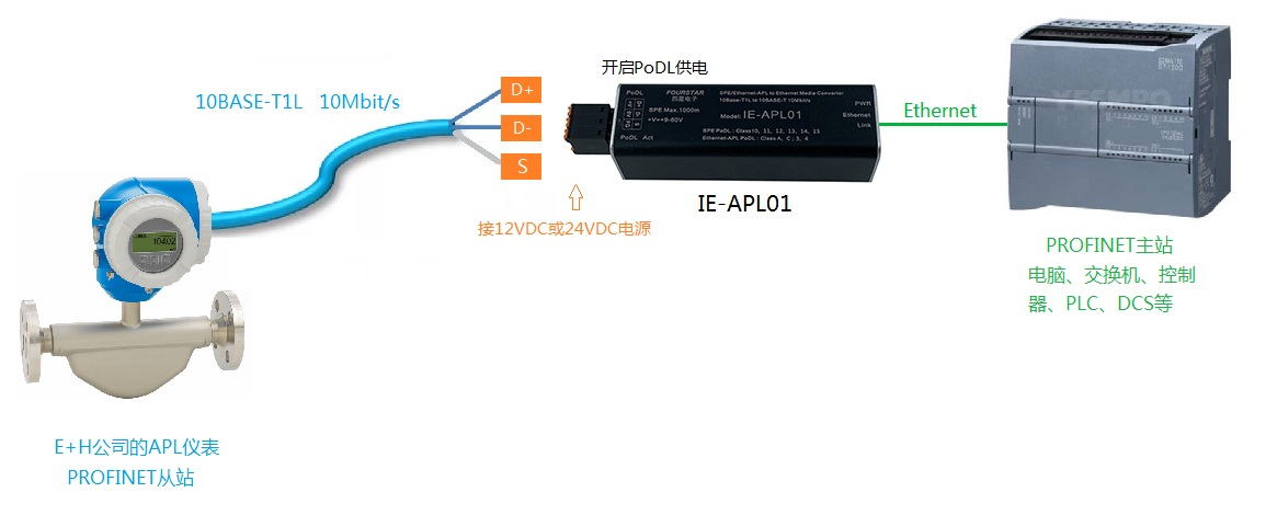 下面是E+H公司的APL儀表采用四星電子APL介質(zhì)轉(zhuǎn)換器和APL現(xiàn)場交換機,連接上位PROFINET主站控制器(PLC、DCS等)的各種連接拓撲,根據(jù)APL儀表要求的數(shù)據(jù)線供電電壓來決定四星電子APL介質(zhì)轉(zhuǎn)換器和APL現(xiàn)場交換機的工作電源電壓采用12VDC或是24VDC。