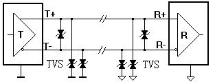 由于本裝置采用平衡差分傳輸方式,因而具有良好的抗電磁干擾能力,光電隔離電路能有效的抑制地電位差的干擾。采用屏幕電纜對抑制射頻干擾很有效,但屏蔽電纜線的電容較大,會相應(yīng)降低通訊速率。除上述常見干擾因素外,瞬態(tài)電壓干擾是威脅通訊接口安全的元兇之一。