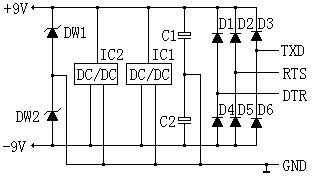 本裝置不需外接電源,其工作電源從RS232接口上竊取。如圖4所示:圖中TXD、RTS、DTR是RS232的輸出信號,每根信號線可提供約9mA的輸出電源,通訊時其電壓在+10V和-10V之間跳變,通訊停止后其電壓極性不定,但開機(jī)上電時全部為-10V。該三個信號經(jīng)D1~D6全波整流和C1、C2濾波后得到+9V和-9V直流電壓,若是開機(jī)上電狀態(tài)則只有-9V電壓。IC1和IC2分別是負(fù)電壓到正電壓轉(zhuǎn)換器和正電壓到負(fù)電壓轉(zhuǎn)換器,將輸入電壓轉(zhuǎn)換極性并升壓,這樣無論TXD、RTS、DTR是什么極性都能在DW1和DW2端得到+9V和-9V的穩(wěn)定電壓。亦即不需靠軟件設(shè)置來得到工作電壓,確保適合所有軟件!其實(shí)只需以上任意一根信號線即可滿足要求。