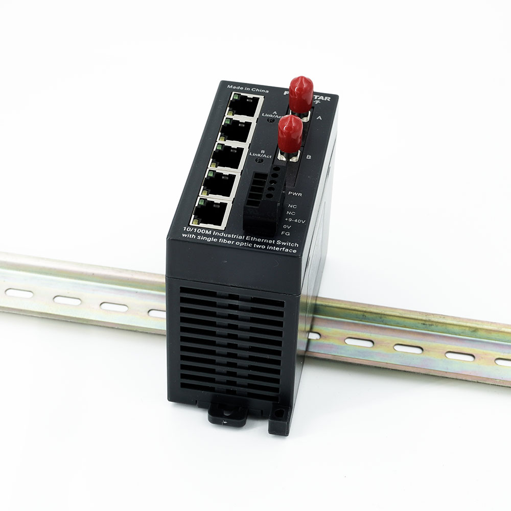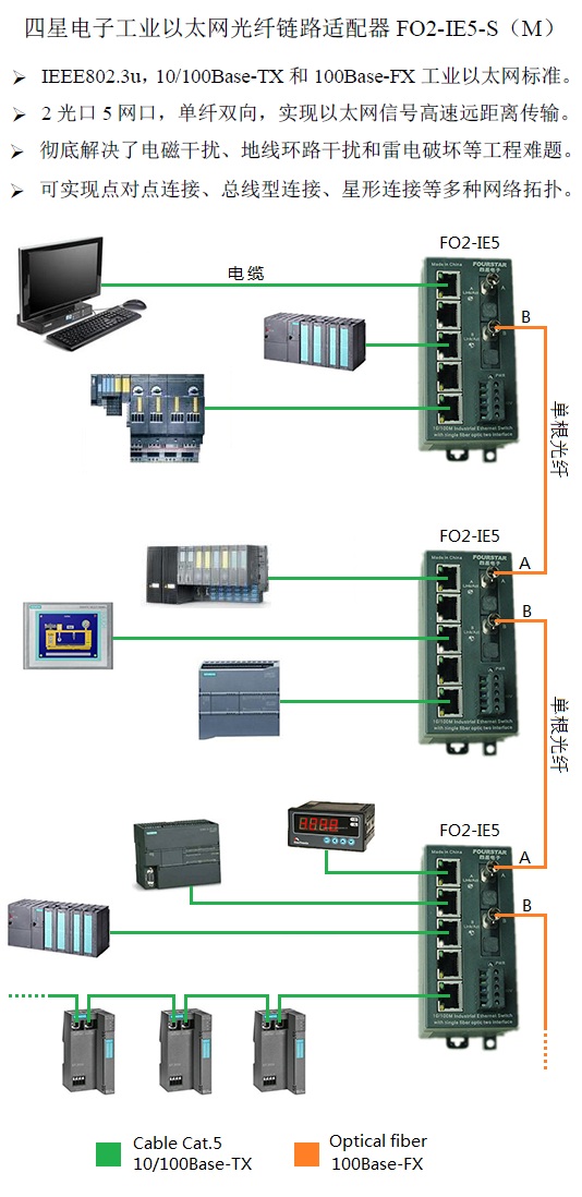 單纖2光5電工業(yè)以太網(wǎng)單模光纖鏈路適配器。2對(duì)單纖接口和5個(gè)RJ45以太網(wǎng)交換機(jī)電接口,符合IEEE802.3u,10/100Base-TX和100Base-FX工業(yè)以太網(wǎng)標(biāo)準(zhǔn),網(wǎng)口速率10/100M自適應(yīng),光口速率100M,電源端口-網(wǎng)口-光纖端口全部隔離,光纖接頭標(biāo)配ST接頭,適用光纖:?jiǎn)文?/125、10/125、8.3/125um,最大傳輸距離20km。DIN35mm標(biāo)準(zhǔn)導(dǎo)軌安裝或螺栓固定安裝,-20~+75℃工業(yè)級(jí)寬溫型。