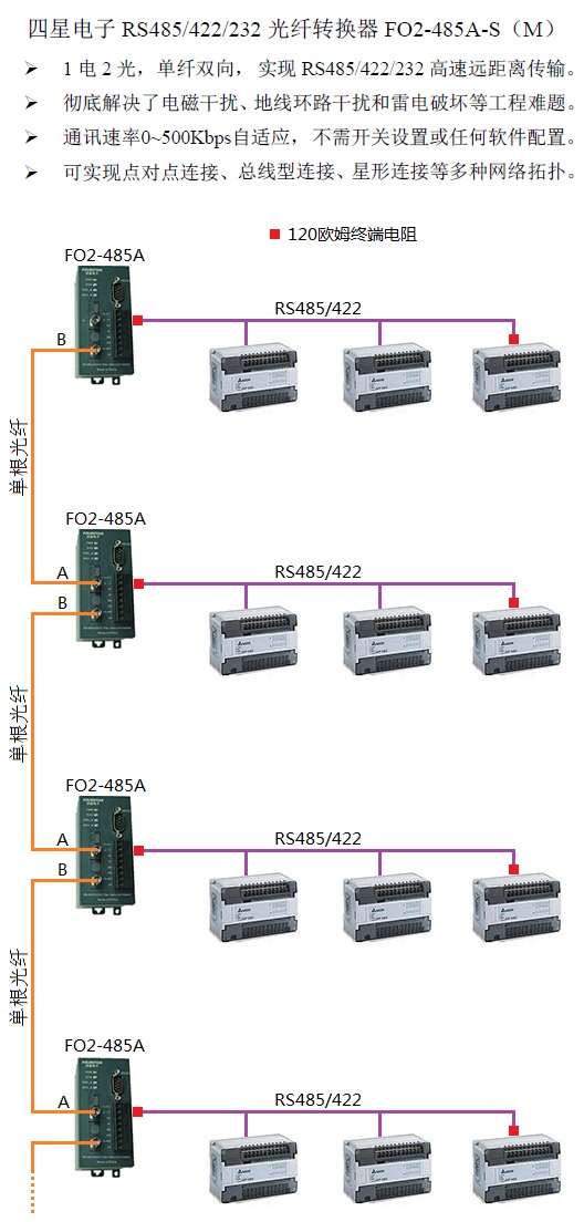 單纖雙光口RS485/422/232多模光纖鏈路模塊。1電2光,單纖傳輸,實(shí)現(xiàn)RS485/422/232信號高速遠(yuǎn)距離傳輸,徹底解決通訊中的電磁干擾、地線環(huán)路干擾和雷電破壞等工程難題??蓪?shí)現(xiàn)點(diǎn)對點(diǎn)、總線型、星形和混合型光纖網(wǎng)絡(luò)。數(shù)據(jù)透明傳輸,無需改動原有的通信協(xié)議和軟件,速率0~500Kbps自動適應(yīng),9~40VDC寬電壓隔離供電,適用光纖:多模62.5/125um、50/125um,光纖傳輸距離:0~2km,ST光纖接頭,-40~+85℃工業(yè)級工作溫度,DIN35mm標(biāo)準(zhǔn)導(dǎo)軌安裝。