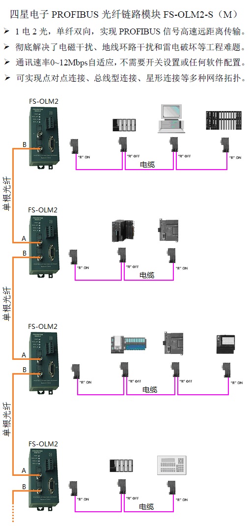 單纖雙光口PROFIBUS多模光纖鏈路模塊。1電2光,單纖傳輸,實現(xiàn)PROFIBUS信號高速遠距離傳輸,徹底解決通訊中的電磁干擾、地線環(huán)路干擾和雷電破壞等工程難題??商娲鏖T子OLM光纖鏈路模塊,可實現(xiàn)點對點、總線型、星形和混合型光纖網(wǎng)絡(luò)。數(shù)據(jù)透明傳輸,無需改動原有的通信協(xié)議和軟件,速率0~12Mbps自動適應(yīng),9~40VDC寬電壓隔離供電,適用光纖:多模62.5/125um、50/125um,光纖傳輸距離:0~2km,ST光纖接頭,-40~+85℃工業(yè)級工作溫度,DIN35mm標(biāo)準(zhǔn)導(dǎo)軌安裝。